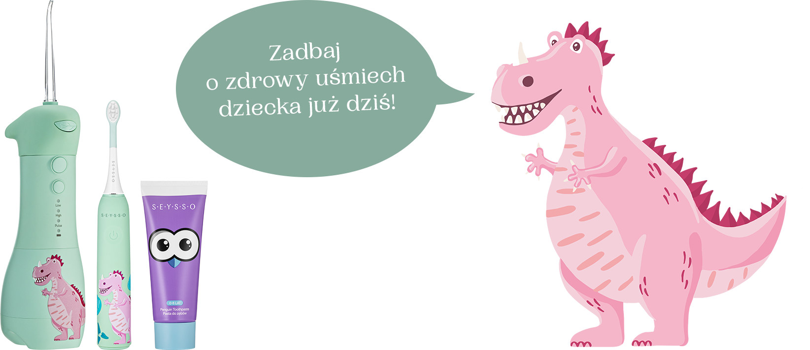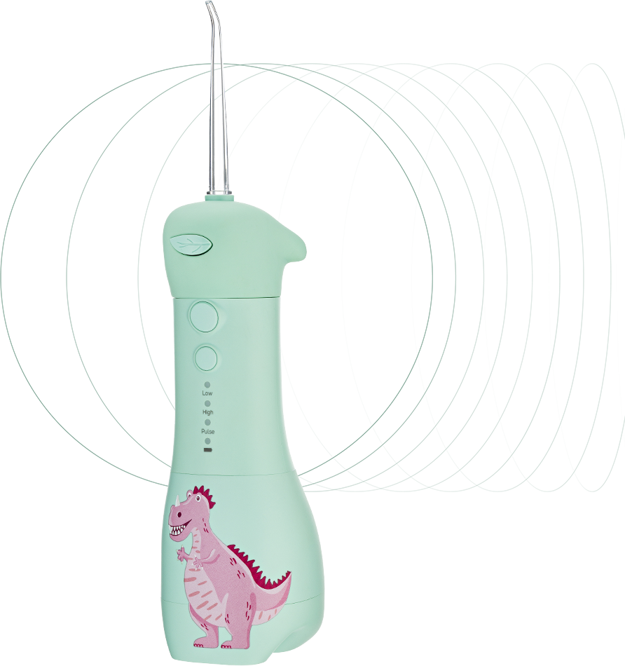 Irygator SEYSSO Dinosaur usuwa resztki jedzenia i bakterie delikatnym strumieniem wody, zapewniając dokładniejsze oczyszczanie i ochronę przed próchnicą.